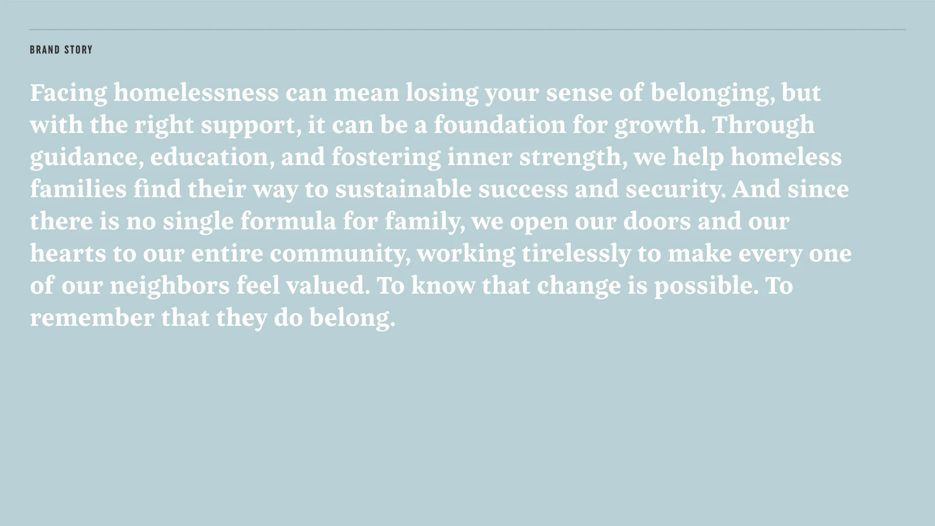 Alpha House of Tampa was a small organization making a giant impact in our community. A mission to help pregnant, homeless women quickly evolved to meet the growing needs of our community and now families of all types are welcome to receive services and temporary housing. This expansion of services brought with it the realization that the Alpha House brand was no longer reflecting the new changes.